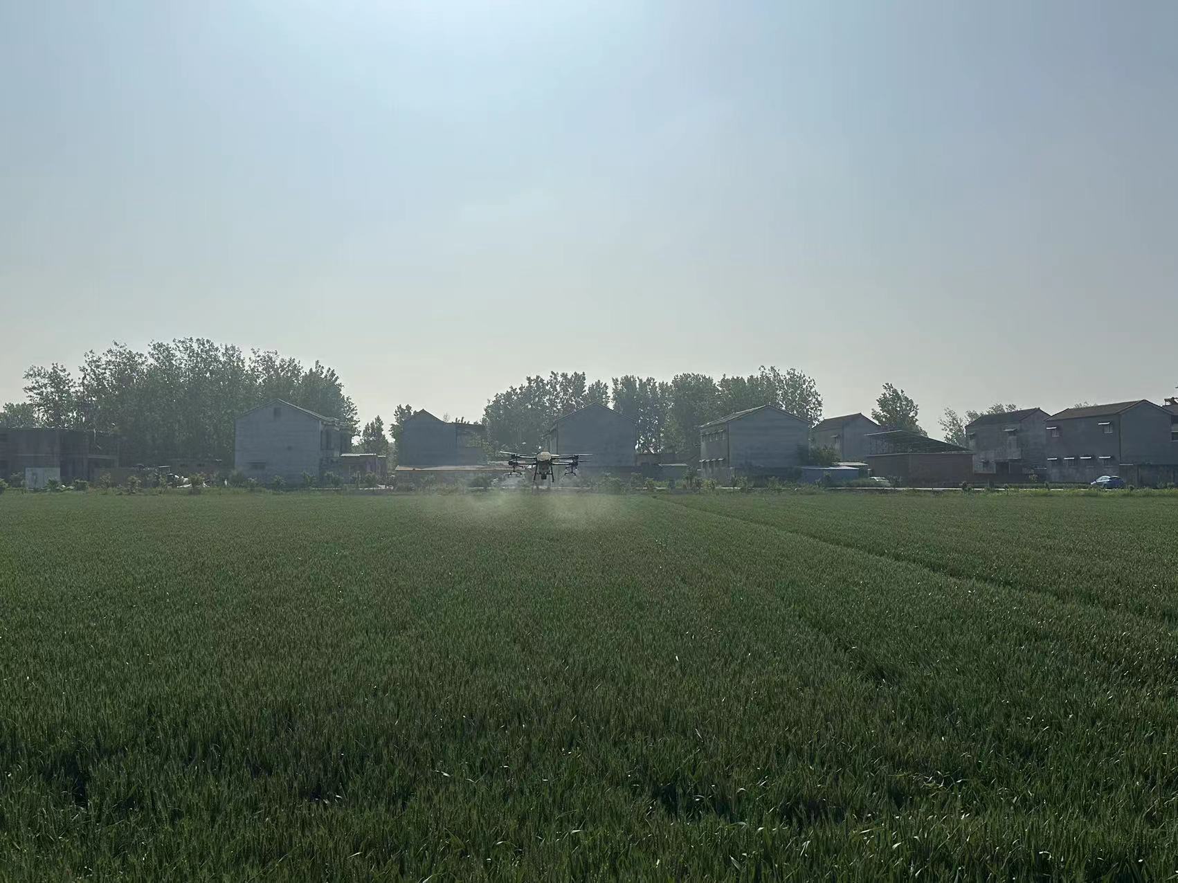 随后,在朱佛村小麦田间,操作手操控植保无人机升空作业,开展了赤霉病等病害统防统治。