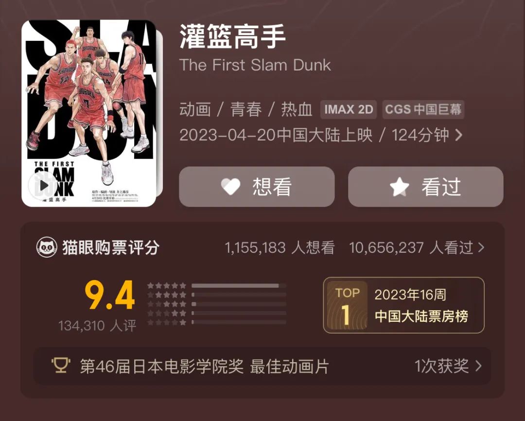 时隔27年,《灌篮高手》以大电影的形式上演完结篇。这部电影在2022年年底于日本首映,截至今年1月4日,共在日本本土拿下67亿日元(约合3亿人民币)的总票房。在今年3月举办的第46届日本电影学院奖上,《灌篮高手》也被评选为最佳动画作品,一同竞争的还有新海诚的新动画《铃芽之旅》和《航海王:红发歌姬》。电影今年4月20日正式在中国内地上映。上映后引发观看热潮,无数人回到电影院去追忆青春,截止到4月24日,4天时间,在内地票房已过4亿。