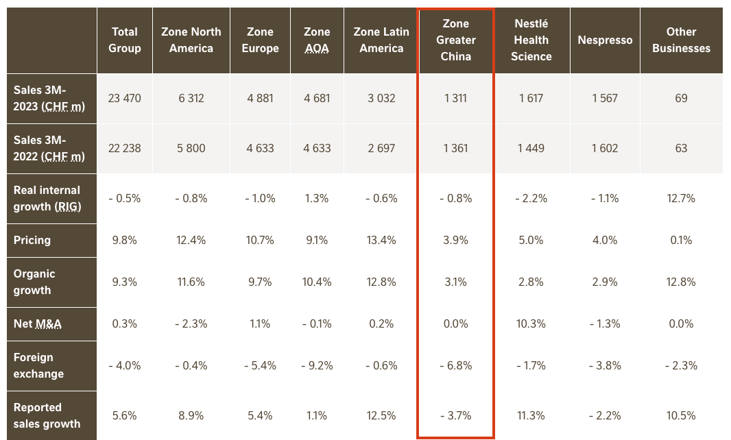 4月25日,雀巢发布2023年第一季度财报。财报显示,第一季度报告总销售额同比增长5.6%,达到235亿瑞士法郎,其中大中华大区报告销售额下降3.7%至13亿瑞士法郎。雀巢确认2023年展望,预计销售额有机增长在6%-8%。