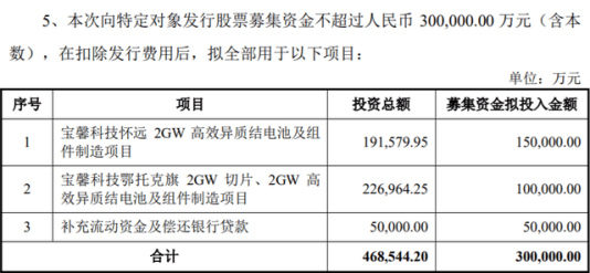 但在资本市场春风得意的宝鑫科技自然有应对措施。抛出了30亿元的定增募资,分别用于怀远2GW高效异质结电池及组件制造项目(总投资19.16亿元,定增募资投入15亿元);宝馨科技鄂托克旗2GW切片、2GW高效异质结电池及组件制造项目(总投资22.7亿元,定增募资投入10亿元);5亿元用于补充流动资金及偿还银行贷款。