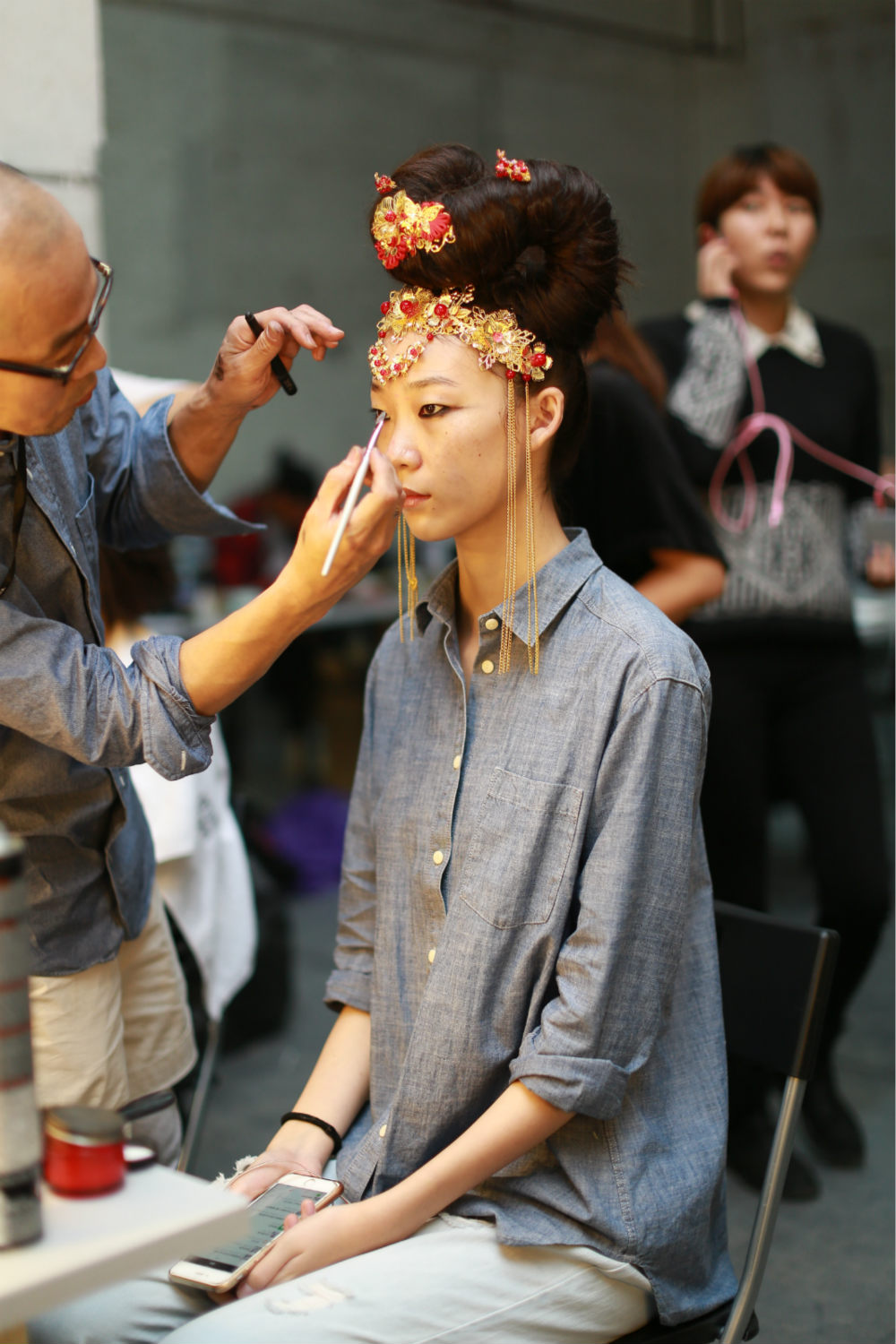 他面前的玻璃矮桌上放着当天刚刚出炉的中文媒体报道,封面便是Nicola Formichetti。身为意大利、日本混血儿,他眉眼间透着股东方味。秀场里的中文站牌、成串红灯笼与模特发髻上的中式发钗,来自他对旧上海的一番臆想。