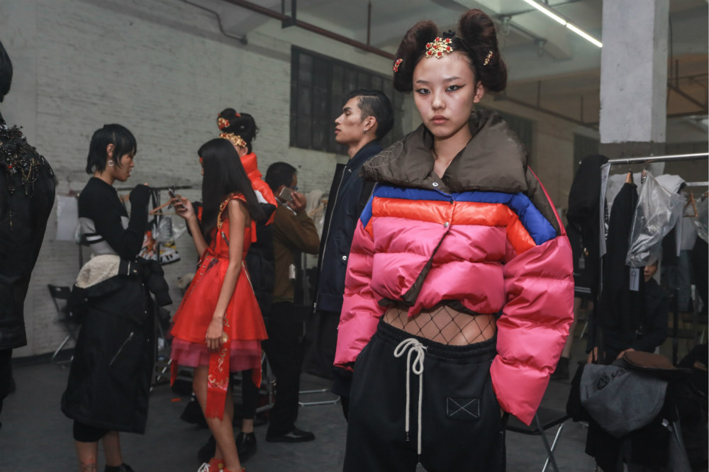 秀场被布置成地下风格。负责搭建的川力企划集团(Apax Group)租用下苏州河边一处旧仓库,隔壁小巷停着几台发电机分秒不停地为场内空调、灯光供电。整栋建筑内部基本保留毛坯状态,墙壁不少地方还露出涂层背后的红砖,入口甚至有扇门上写着“账房间”,这一极具年代感的词。