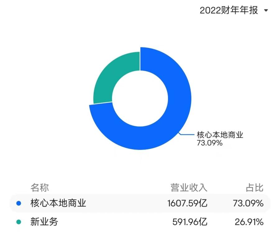 所谓核心本地商业,包括外卖、到店、酒旅及美团闪购、民宿及交通票务等。这部分业务在2022年收入为1607.59亿元,占总营收比重达73.09%,同期美团优选、美团买菜、网约车等新业务收入591.96亿元,占比26.91%。