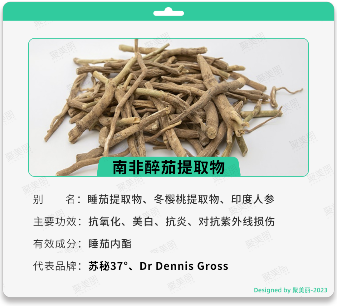 护肤品中通常使用的是南非醉茄的根部提取物,已有植物化学研究证实,其主要含有生物碱、黄酮醇、甾体内酯、甾醇和酚酸等物质,其中,最具生物活性的成分包括西托糖苷(VII、VIII、IX、X)、睡茄碱、睡茄宁和醉茄内酯。