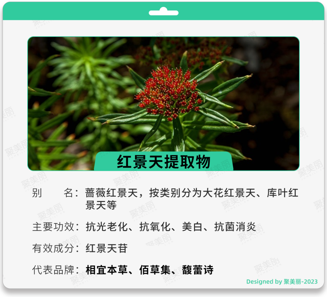 从护肤用途的有效组分来看,红景天提取物中主要包括红景天苷、黄酮类化合物、香豆素、有机酸类化合物等,具有抗氧化、美白、抗炎、抗光老化、抗疲劳等功能,并且其护肤功效已经在长期的临床和体外测试中得到了证实。