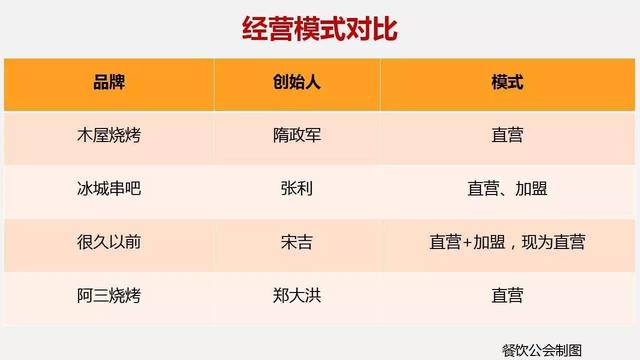 ▲ 木屋烧烤、冰城串吧、很久以前、阿三烧烤4家经营模式对比。