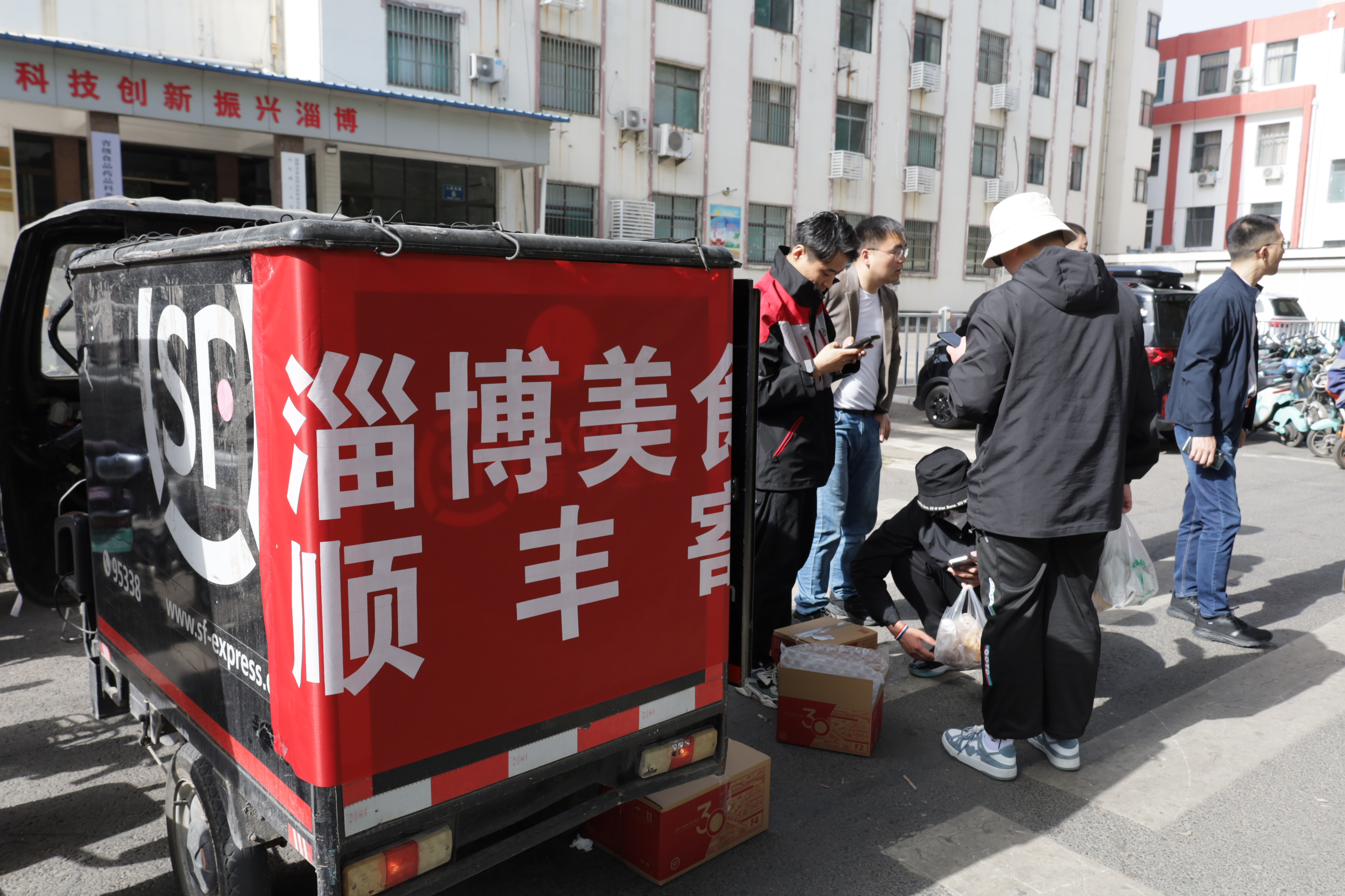 在包装上,当地网点经常承运樱桃等水果,储备的纸箱可达食品级标准,正好可用于包装游客寄递的淄博美食。包装耗材确实需要跟上,马文青告诉界面新闻,他们专门调配了一辆小货运车驻扎在八大局市场附近,专门运送快递耗材,保证游客的寄递需求。