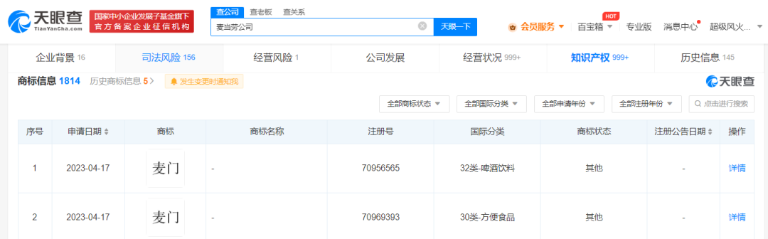 天眼查App显示,近日,麦当劳公司申请注册2枚“麦门”商标,国际分类为啤酒饮料、方便食品,当前商标状态均为申请中。