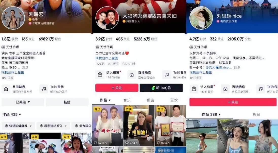 从刘思瑶、程女士等全网拥有千万粉丝的美女网红,到跳毽子操现象级出圈的刘畊宏,靠拍“收租”短视频火的大狼狗夫妇、男扮女装的毛毛姐,再到近来被称之为“娱乐圈许愿池王八”的张大大,这些人背后都站着同一家公司,就是无忧传媒。