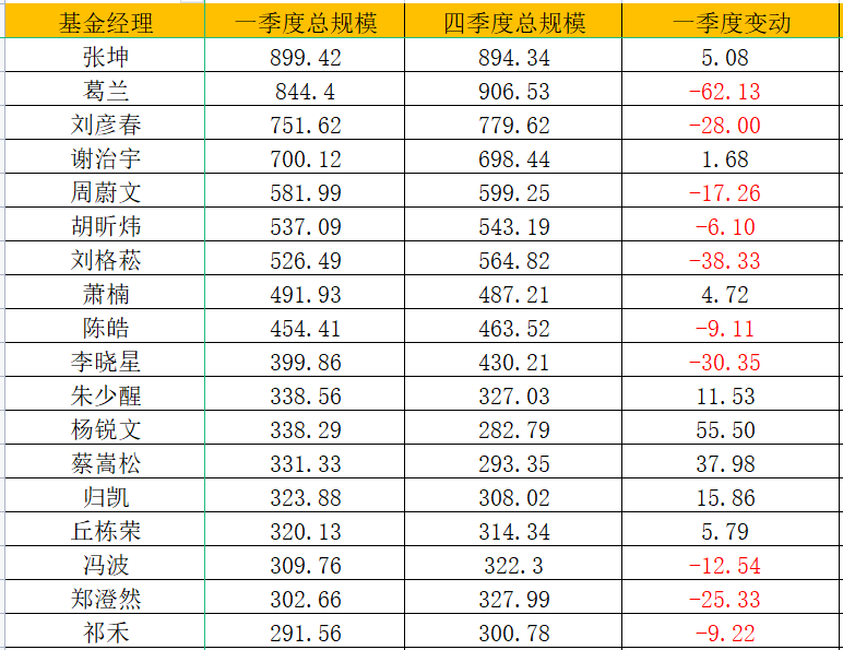 张坤以899.42亿元的总规模重回第一位,葛兰退居第二位,规模为844.4亿元。刘彦春以751.62亿元的规模位居第三位,谢治宇则突破了700亿元,为第四位。