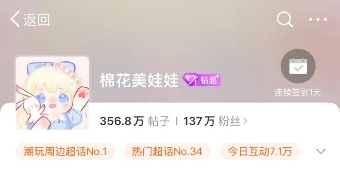 2019年3月13日,新浪微博“棉花美娃娃”超话成立,目前已有137万粉丝,超过“琳娜贝儿”和“BJD”,在潮玩周边超话排名第一。