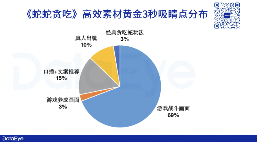 DataEye研究院梳理了《蛇蛇贪吃》2023年以来(截至4月25号),高效视频素材TOP30前三秒吸睛点。数据显示,“游戏战斗画面”占比较高,其次则是“口播+文案推荐”。