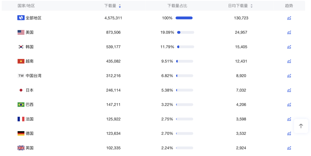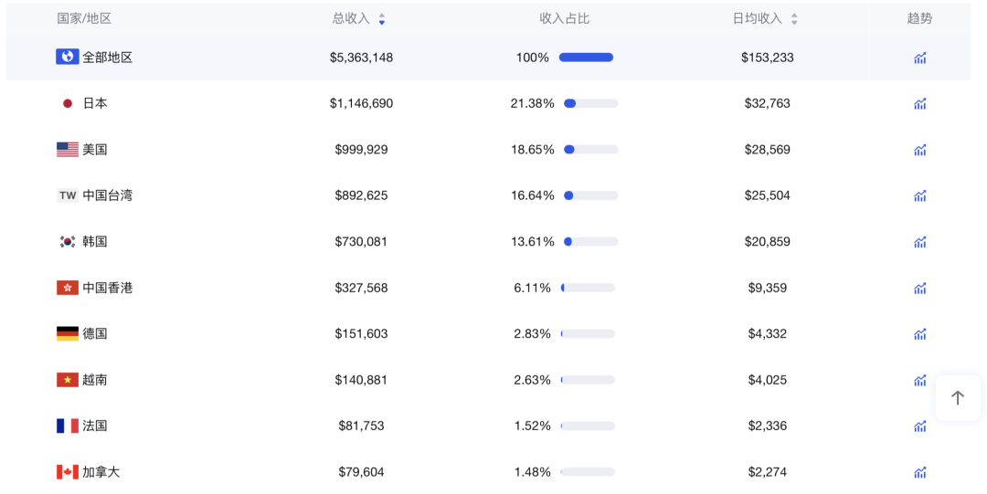 具体到各个市场方面,日本、美国、中国台湾占据双端总收入TOP3位置;美国、韩国、越南三个市场则位居下载量TOP3。