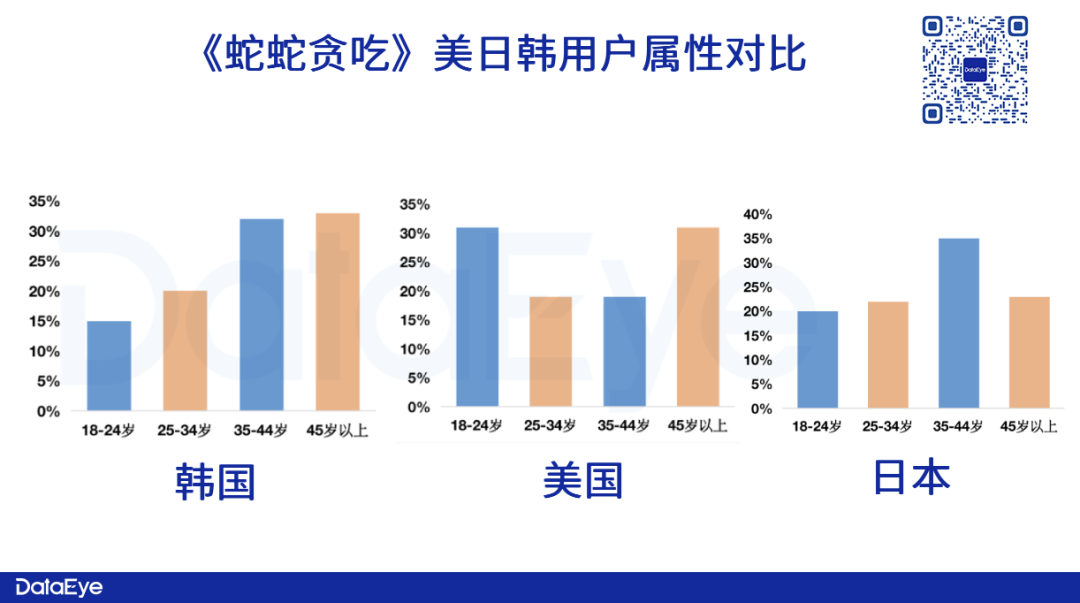 用户年龄分布方面,《蛇蛇贪吃》在韩国、美国、日本三个市场的用户属性呈现不同的趋势。在日本市场,35-44岁人群较为突出,占比约为35%;在韩国市场,35-44岁以及45+的两类用户人群占比较高,均超过30%;在美国市场,则呈现两极分化趋势,18-24岁以及45岁以上用户占比较高,均超过30%。