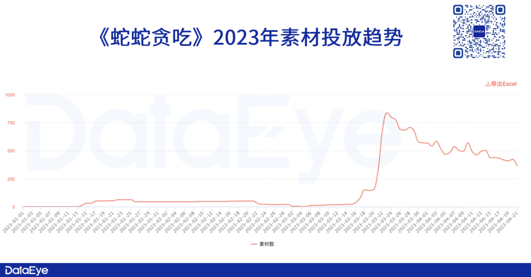 买量投放方面,DataEye-ADX数据显示,《蛇蛇贪吃》在上线前两个月就开始进行小规模素材投放测试,之后在上线当天,投放量大幅飙升——单日投放超过800组,但在此之后素材投放量就呈现明显的下滑趋势。