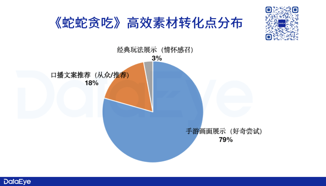 在转化点方面,《蛇蛇贪吃》的高效TOP30视频素材中,手游画面展示(好奇尝试)占比较高,其次则是“口播文案推荐”(从众/推荐)以及经典玩法展示(情怀感召)。