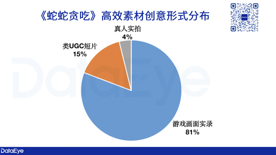 创意形式方面,《蛇蛇贪吃》的高效TOP30视频素材中,“游戏实录”为主要创意形式包装素材,占比超过70%。
