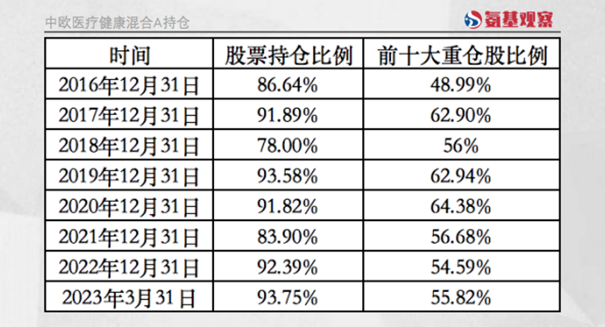 两个数字,完美概括葛兰的风格。资本市场跌宕起伏,但葛兰的持仓比例只有3个年头低于90%;前十大重仓股比例,基本超过55%,单一个股的持仓如爱尔眼科常年保持10%的仓位。