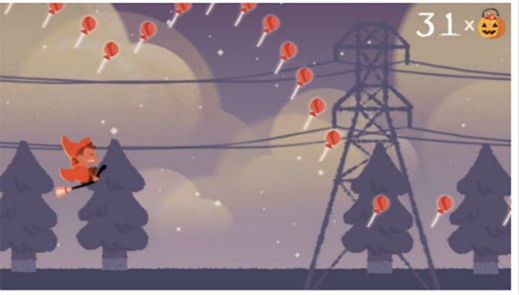 去年万圣节,Google Doodle 推出的小游戏是“糖果世界杯”,就是小巫师骑着飞天扫帚收集各种糖果,类似于超级马里奥那种。