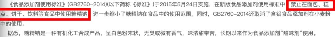 2015年,中国发布新版《食品添加剂使用标准》规定,禁止在饮料等食品中使用糖精钠。