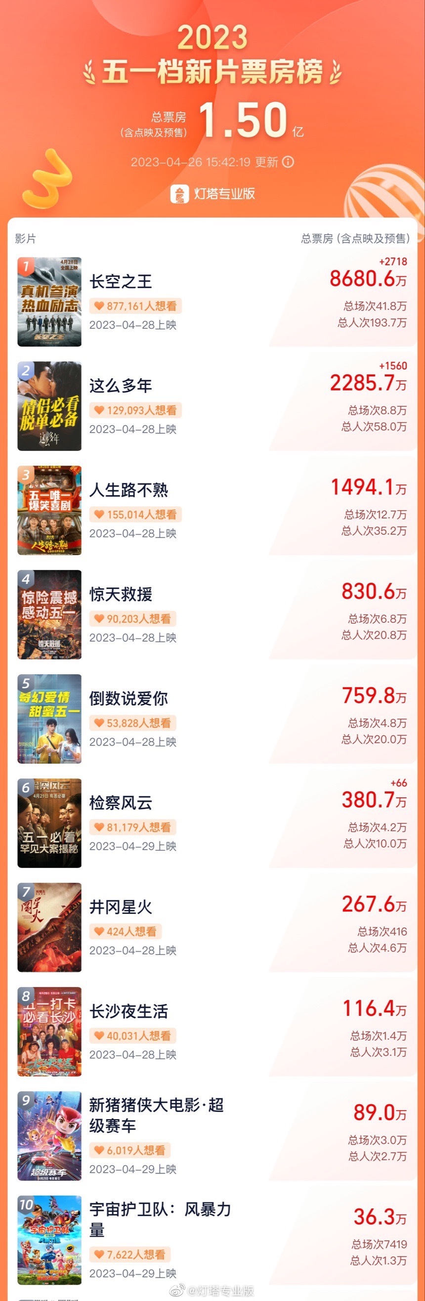 据灯塔专业版实时数据,截至4月26日15时42分,2023年五一档新片预售总票房(含点映)突破1.5亿元。