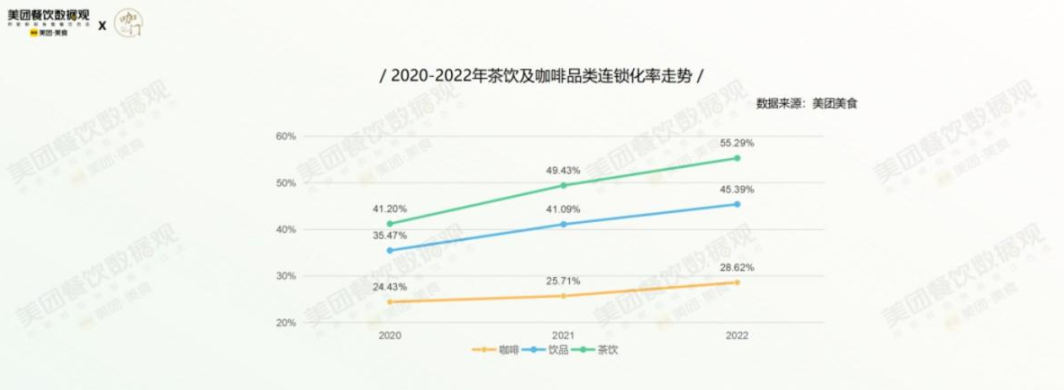 巨头不断攻城略地,留给品牌们大展身手的时间的确不多了。据中国连锁经营协会发布的《2022新茶饮研究报告》显示,2020-2022年新茶饮的连锁化率从41.2%提升到55.2%。在多个城市核心商圈的抽样调查中,新茶饮的连锁化率已超80%。