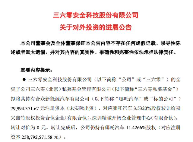 对此,哪吒汽车于次日发布公告回应,此次由360转让部分股权,有利于改善公司治理结构,提高经营团队的控制权。哪吒汽车还称,双方今后还将在数字安全、智能驾驶安全等领域持续合作。
