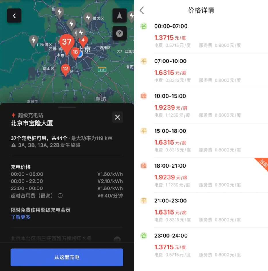 深途对比发现,已经开放的特斯拉北京宝隆大厦超充站采用的是波峰波谷分段计价,1.6元-2.1元/kWh,距离很近的一个特来电充电站,价格为1.37元-1.92元/kWh。相比之下特斯拉更贵。