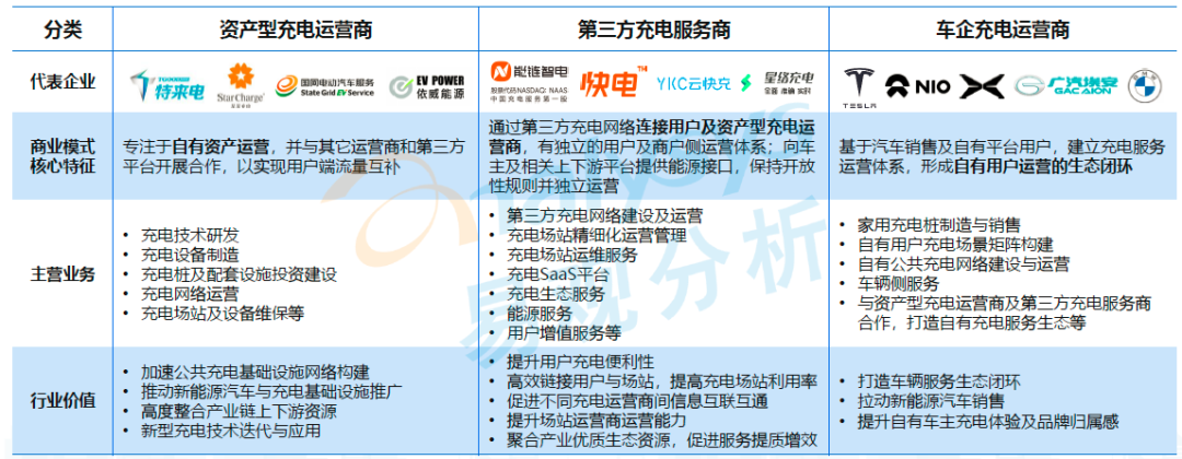 中国公共充电服务运营商主要分三类:一是资产型充电运营商,以特来电、星星充电等为代表的;二是连接型充电服务商,以能链智电、快电、云快充等为代表;三是车企充电运营商,以特斯拉、蔚来等为代表。