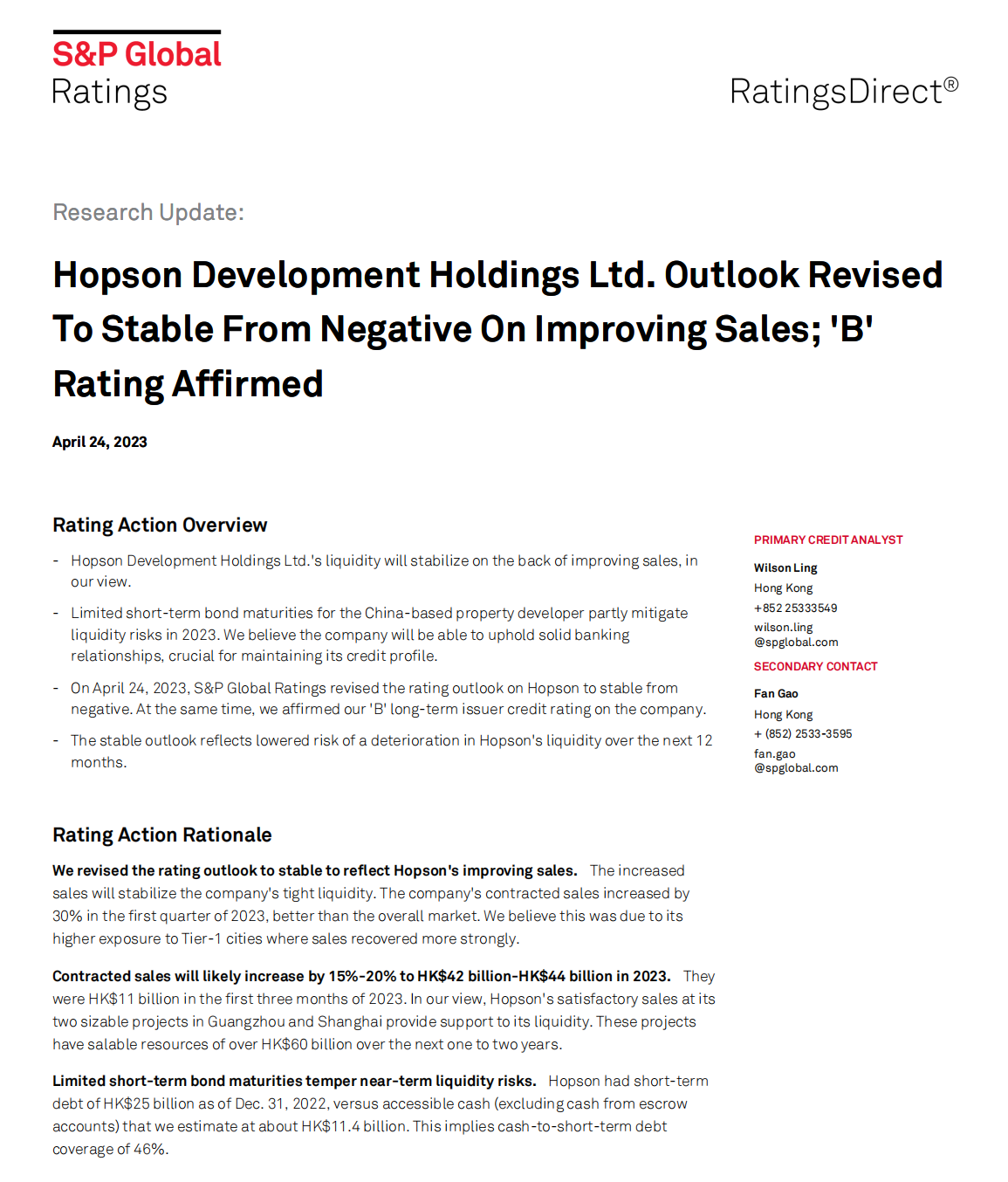 4 月 24 日,标普将合生创展集团有限公司(Hopson Development Holdings Limited,简称“合生创展集团”,00754.HK)的评级展望从负面调整至“稳定”,同时,标普确认了该公司的“B”长期发行人信用评级。稳定的展望反映了未来12个月合生创展集团流动性恶化的风险降低,这也是自2022年以来中国房地产民营企业中极少数修复其国际信用评级的企业之一。