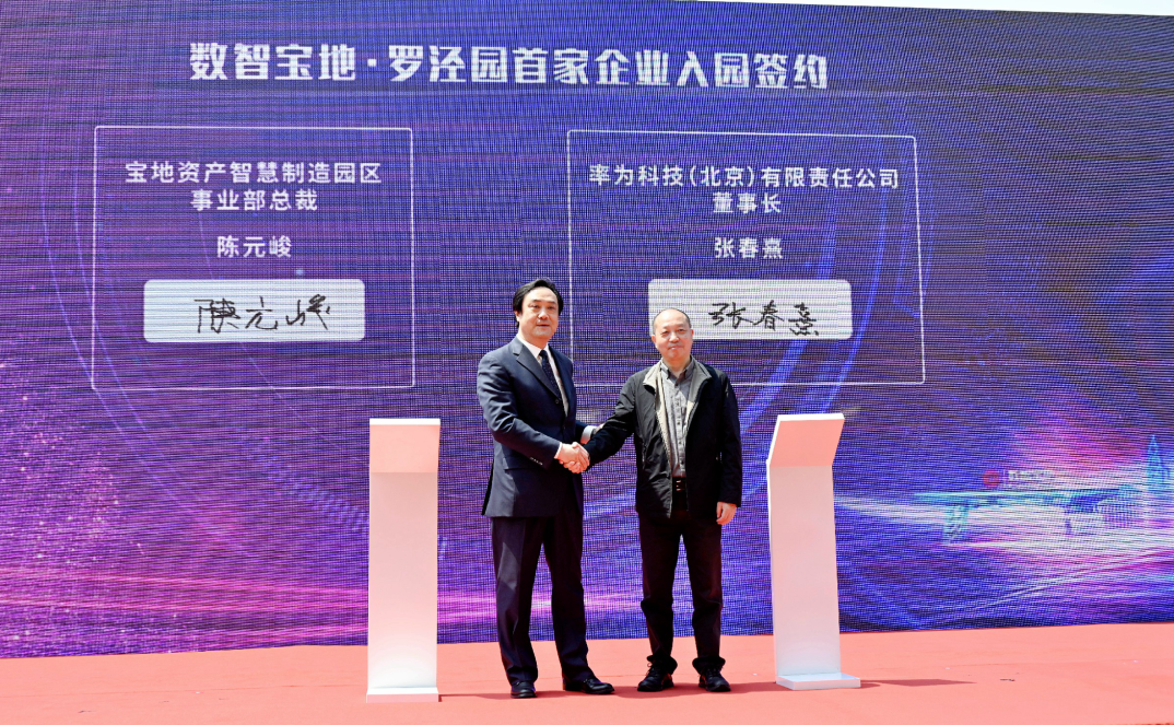 宝地资产智慧制造园区事业部总裁陈元峻、率为科技(北京)有限责任公司董事长张春熹,共同签署入园意向协议。