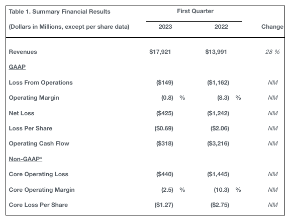4月26日,波音公司发布2023年第一季度业绩报告。报告显示,第一季度营收同比增长28%,达到179.21亿美元;GAAP净亏损4.25亿美元,上年同期亏损12.42亿美元。波音方面表示,2023年仍有望交付400架至450架737飞机;计划在今年晚些时候将产量提升到每月38架。此外,公司积压订单总额达4110亿美元,其中包括4500多架民用飞机。