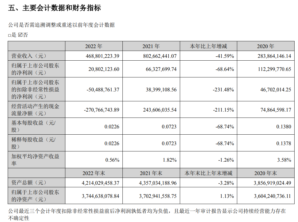 并没有。根据其2022年财报资料显示,营业收入为4.86亿元,同比2021年的8.03亿元下降41.59%;实现净利润2080.21万元,相比较于2021年的6632.77万元下降68.64%,可以说是营收和净利润都接近“腰斩”级别。
