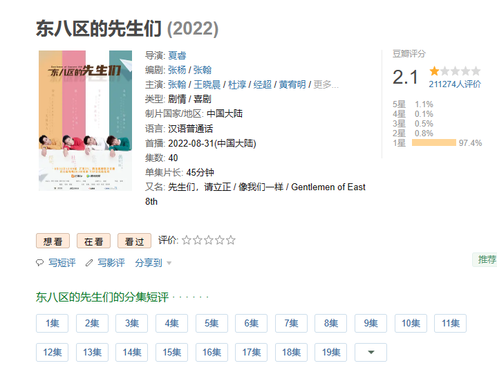 而另外一部剧《东八区的先生们》可谓是2022年第一雷剧,剧集也因为各种雷人桥段被网友大骂油腻,让张翰积攒多年的人品被群嘲殆尽,豆瓣评分只有2.1分,最后也是被骂到全网下线。