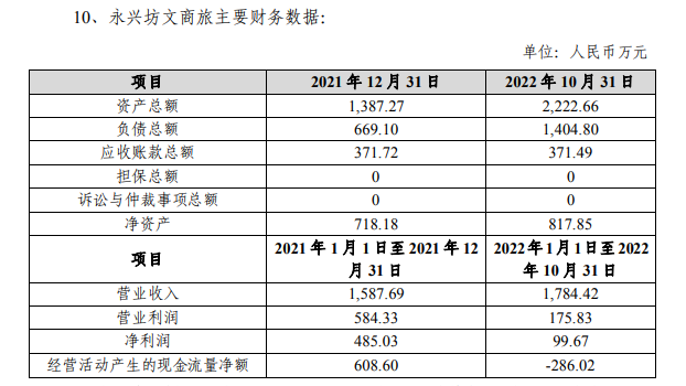 根据公告材料显示,2021年全年及2022年前10月,永兴坊文商旅营收分别为1587.69万元、1784.42万元,净利润分别为485.03万元、99.67万元,资产负债率分别为48.23%、63.20%。