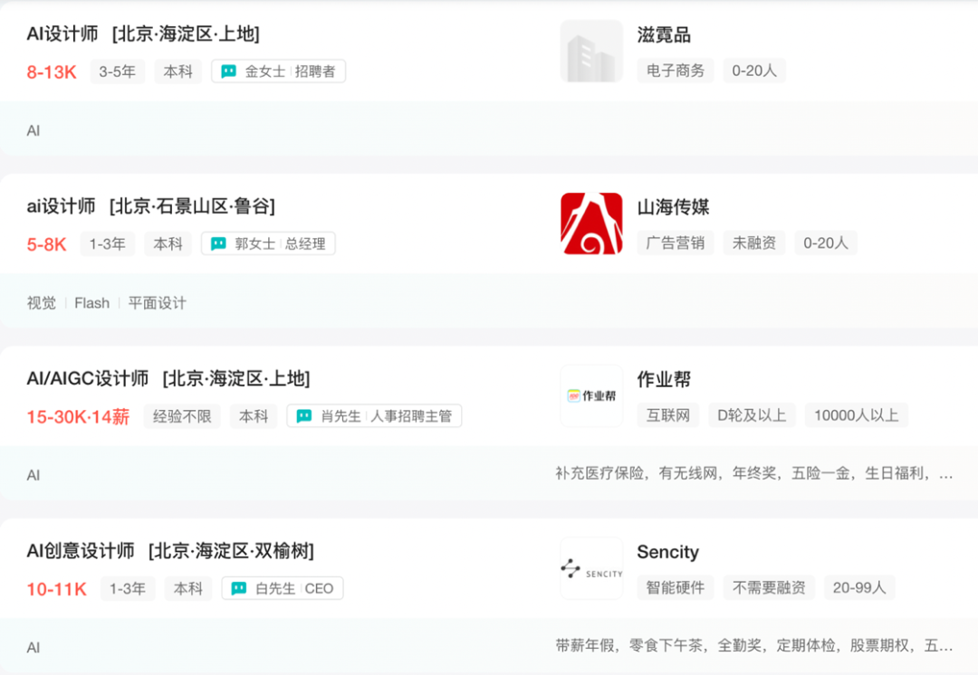 BOSS 直聘中,许多公司都设立了「AI 设计师」一职。岗位职责包括,熟练使用 Stable Diffusion 等 AIGC 设计工具、深入应用 controlnet 等插件,负责 lora 模型训练等等。