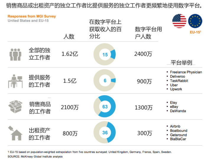 三种工作者符合麦肯锡的“独立工作者”定义:提供服务的工作者、销售商品的工作者和出租资产(比如空余房间)的工作者。这三种类型都要求工作者投入一定的精力和时间,且许多独立工作者可能会同时做两种以上类型的工作。