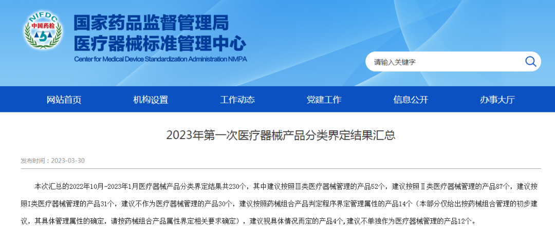 据介绍,本次医疗器械标准管理中心汇总的2022年10月-2023年1月医疗器械产品分类界定结果共230个,建议按照Ⅲ类医疗器械管理的产品52个;建议按照Ⅱ类医疗器械管理的产品87个;建议按照I类医疗器械管理的产品31个;建议不作为医疗器械管理的产品30个。此外还有建议按照药械组合产品判定程序界定管理属性的产品、建议不单独作为医疗器械管理的产品等。
