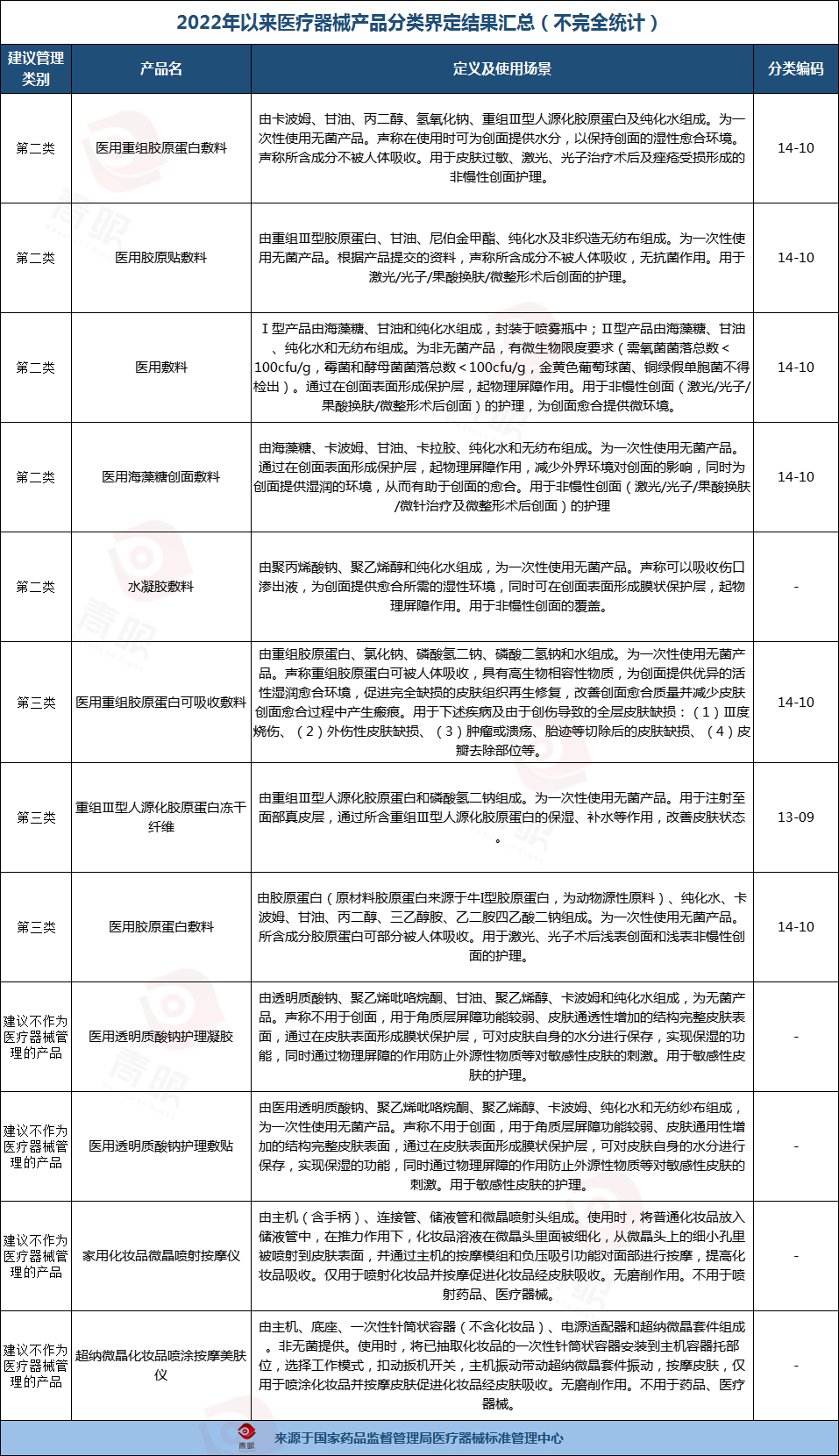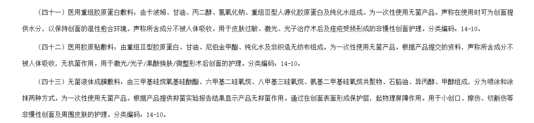 除上文提及的建议按照Ⅱ类医疗器械管理的医用重组胶原蛋白敷料、医用胶原贴敷料外,在过往发布的结果汇总中,医疗器械标准管理中心还将医用敷料、医用海藻糖创面敷料、水凝胶敷料这三款产品列为“建议按照Ⅱ类医疗器械管理”的范畴。