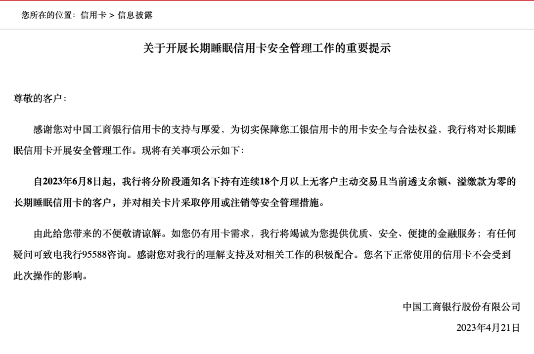 公告称自2023年6月8日起,我行将分阶段通知名下持有连续18个月以上无客户主动交易且当前透支余额、溢缴款为零的长期睡眠信用卡的客户,并对相关卡片采取停用或注销等安全管理措施。
