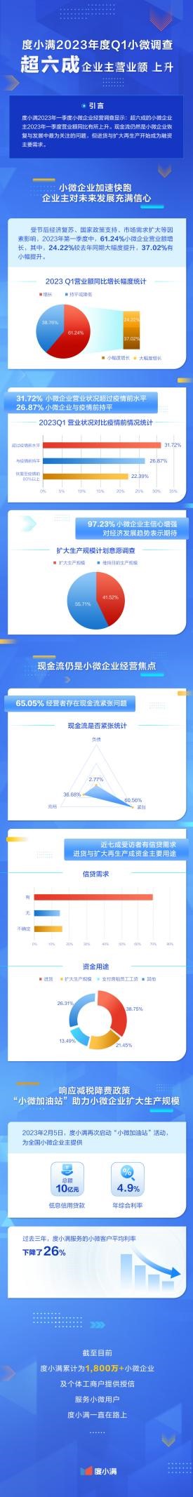 度小满2023年一季度小微企业经营调查显示:超六成的小微企业主2023年一季度营业额同比有所上升。现金流仍然是小微企业恢复与发展中最为关注的问题,但进货与扩大再生产开始成为融资主要需求。