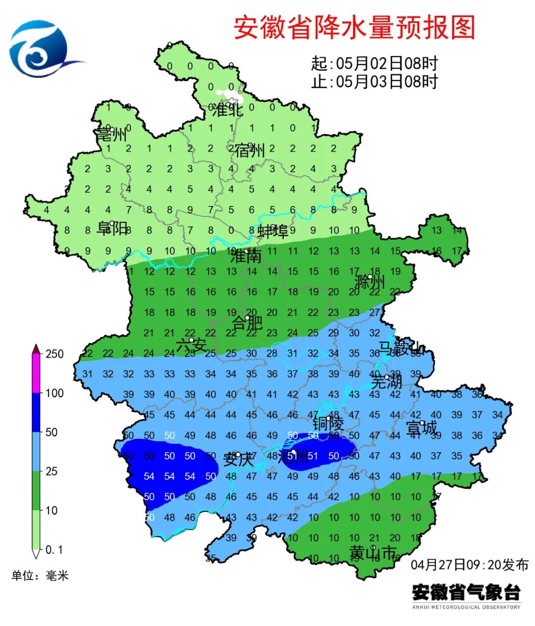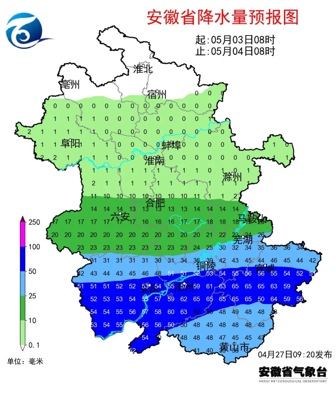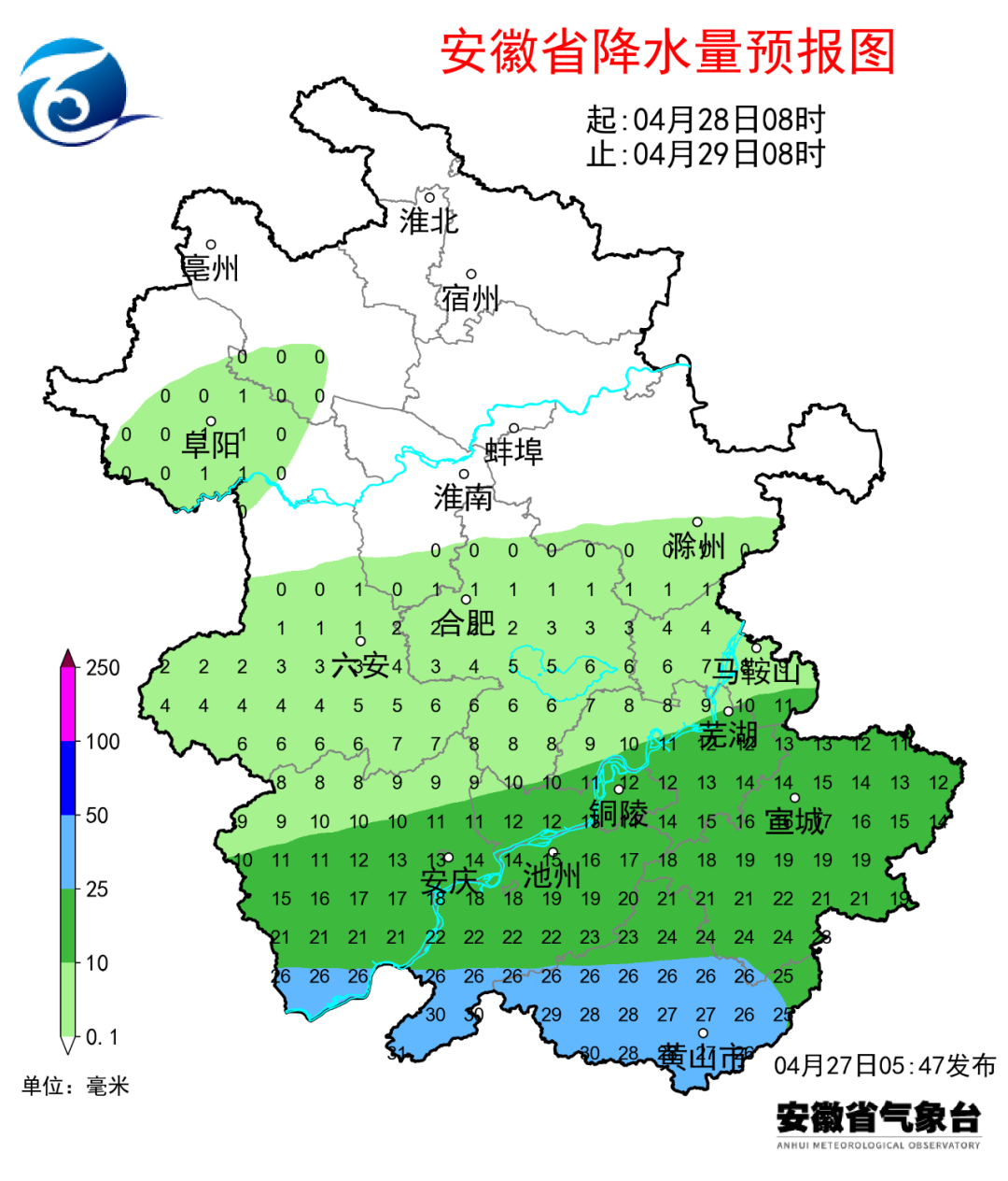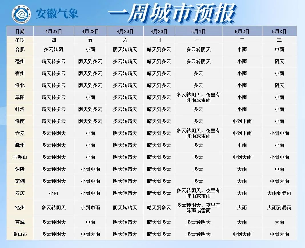 27日(周四):淮北地区晴天转多云;淮河以南多云转阴天,大别山区和江南部分地区有小雨。28日(周五):淮北地区阴天到多云;沿淮淮河以南阴天,大部分地区有小雨,其中大别山区南部和江南中雨,局部大雨。29日(周六):淮北地区多云转晴天;淮河以南阴天转晴天。30日(周日):全省晴天到多云。5月1日(下周一):全省多云转阴,夜里西部部分地区有阵雨或雷雨。2日(周二):全省阴天。淮北地区有小雨;淮河以南有小到中雨,其中大别山区和沿江江南部分地区大雨,局部暴雨。