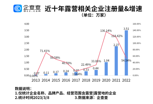 近十年露营相关企业注册量&增速。图源:企查查