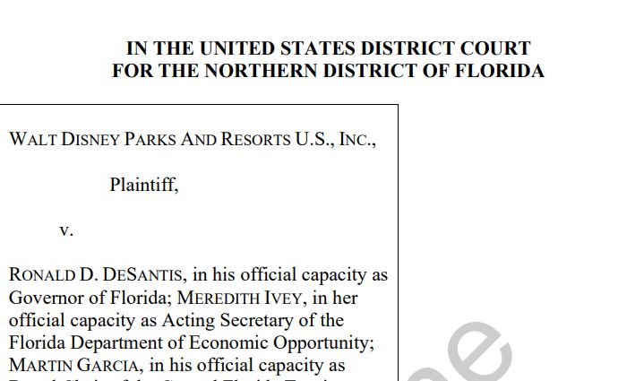 当地时间4月26日,迪士尼正式向佛州北区法院提交诉状,把德桑蒂斯及其任命的监督委员会告上法庭。
