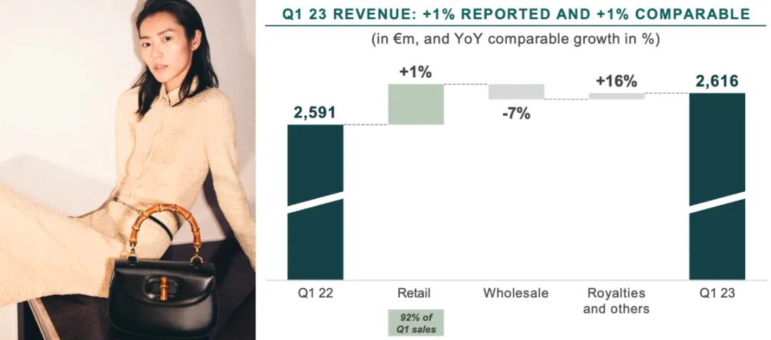 第一季度中,Gucci收入达到26.16亿欧元,在报告和可比基础上都增长了1%。