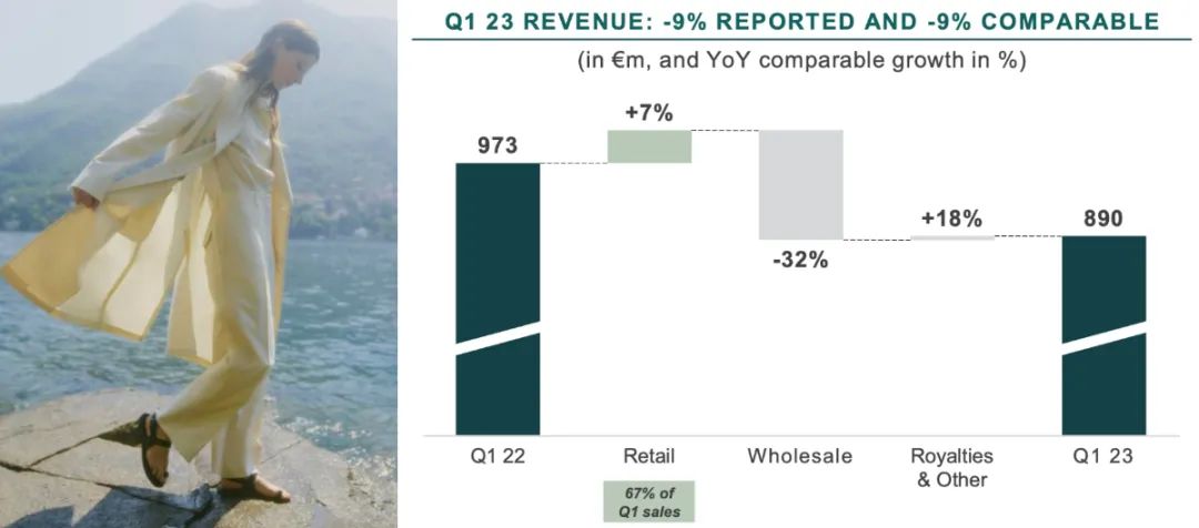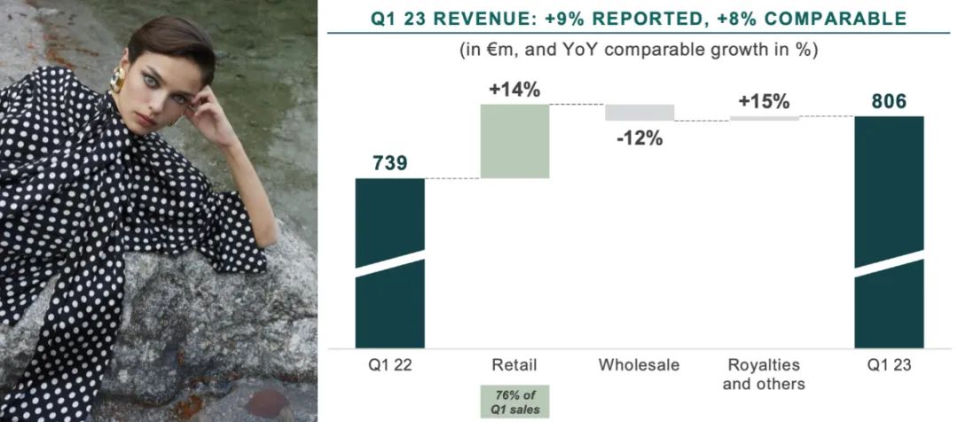 与2022年第一季度相比,直营店网络的销售额同比增长1%。所有关键产品类别的收入都有所增长,尤其是手袋、「Valigeria 旅行世界」系列配件和女装成衣。经典系列仍然非常成功,新系列则大受欢迎。批发收入在可比基础上下降了7%。
