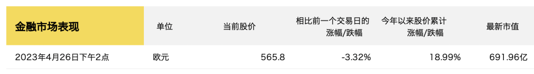 开云集团的一季度收入增速远远落后于同一时期发布财报的竞争对手 LVMH(+17%)和爱马仕(+23%)。财报发布后的第二天(4月26日),截至巴黎时间下午2点(北京时间晚8点),开云集团股票较上一交易日下跌3.32%至565.8欧元/股,当前市值约为692亿欧元。今年以来,集团股票上涨近19%。