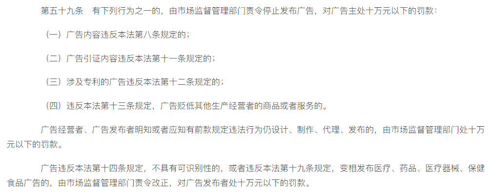 否则,相关主体将按照《中华人民共和国广告法》第五十九条的规定承担法律责任。即,由市场监督管理部门责令改正,对广告发布者处十万元以下的罚款。