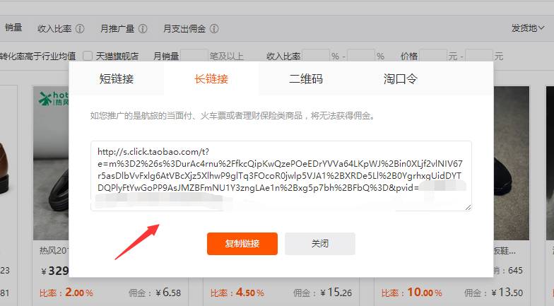 这个时候能会到有短链、长链、二维码、淘口令,怎么方便怎么来,如果你PC端的话是,可以弄个长链先复制下来,就点复制这条链接。