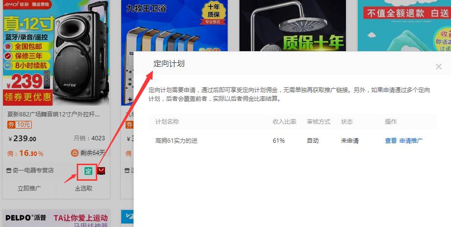定向计划:定项计划是卖家为了淘客中某一个细分群体设置的一个推广计划。作为卖家,可以选择淘宝客来申请加入。他跟鹊桥有点不一样,就是淘客去推广这个定项计划,不用再给发起这个活动的商家去返点。如果是鹊桥的话要给发起活动的淘客返点,而定向不用。(定向计划未必佣金最高)